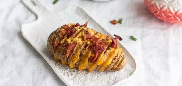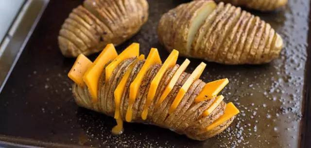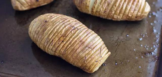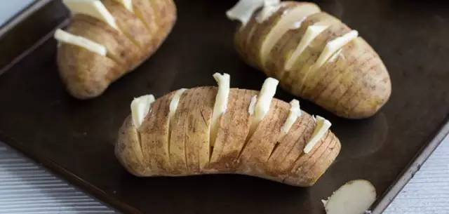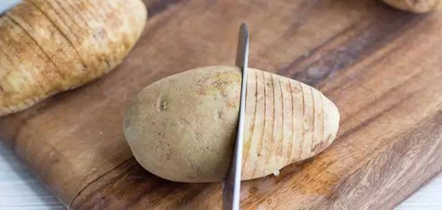 1、烤箱预热至200摄氏度,接下来是切土豆,每一刀之间大约像个3毫米,但千万记得不要切断底部。