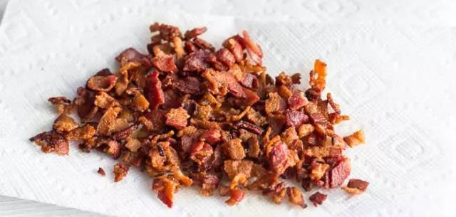 8、撒上培根碎,然后放回烤箱烤大概5分钟至到芝士融化。不喜欢培根太干的话,可以出炉再撒