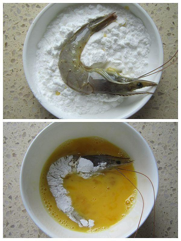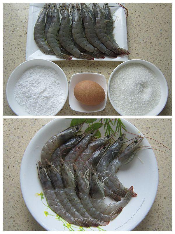 白虾、鸡蛋、淀粉、椰蓉(面包糠)、盐、料酒、胡椒。