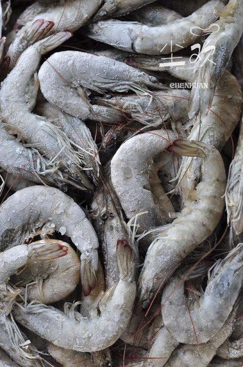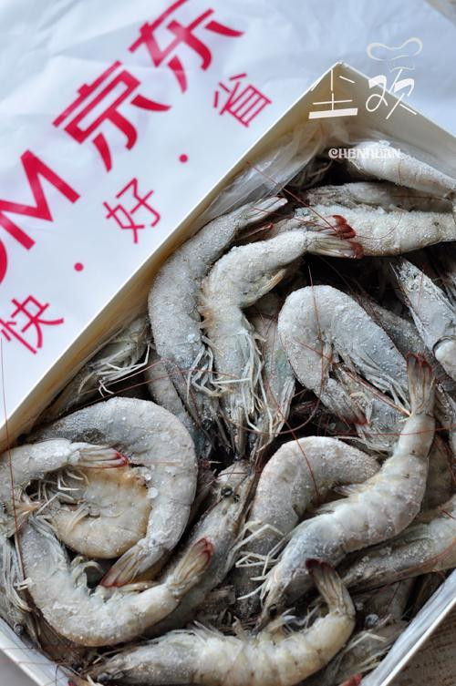 2、虾去腹部的壳和虾线。(也可按个人喜好头部也去掉。)