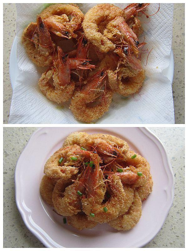 10、炸好的虾摆盘装饰几粒香葱末,食用时可以搭配个人喜欢的蘸料。