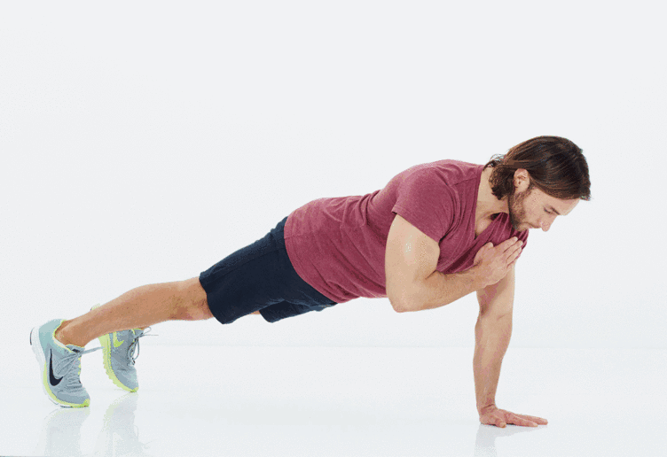 2、一组12次,与标准俯卧撑无异,在起来之时,将右手放至左肩,下次将左手放至右肩。