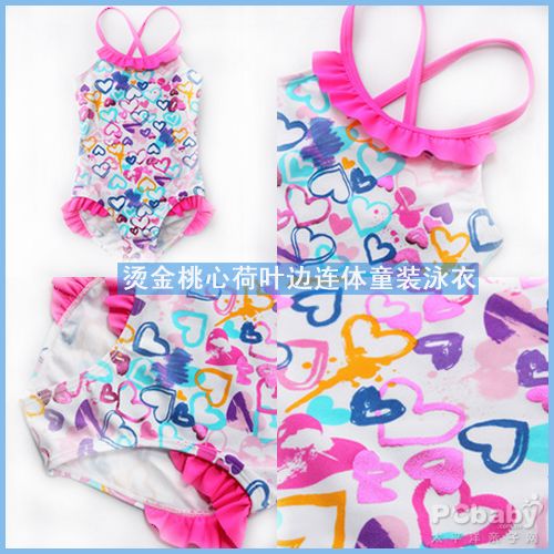 这件泳衣给小编的第一印象就是“可爱、俏皮”。交叉吊带的设计、白色的底色和五颜六色的烫金桃心,这些元素都是为俏皮的宝宝设计。镶嵌在领口和裤边桃红色的蕾丝边,又会让你的宝宝显得如此可爱。穿上它,带你的宝宝去享受这个色彩斑斓的夏季吧!