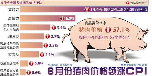 国家统计局昨天公布的数据显示,在食品类的肉禽及其制品中,以猪肉价格上涨最多,猪肉价格上涨57.1%,影响价格总水平上涨约1.37个百分点,占CPI涨幅的21.4%。