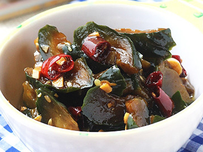 3、将锅烧热放入食用油,然后放入花椒八角,小火将它们炸出香味,颜色变深后捞出不用;将干辣椒放入,小火将干辣椒炸至微变色;放入葱姜炸香;然后放入酱油、醋、白糖,烧开后关火,然后放入蒜末。