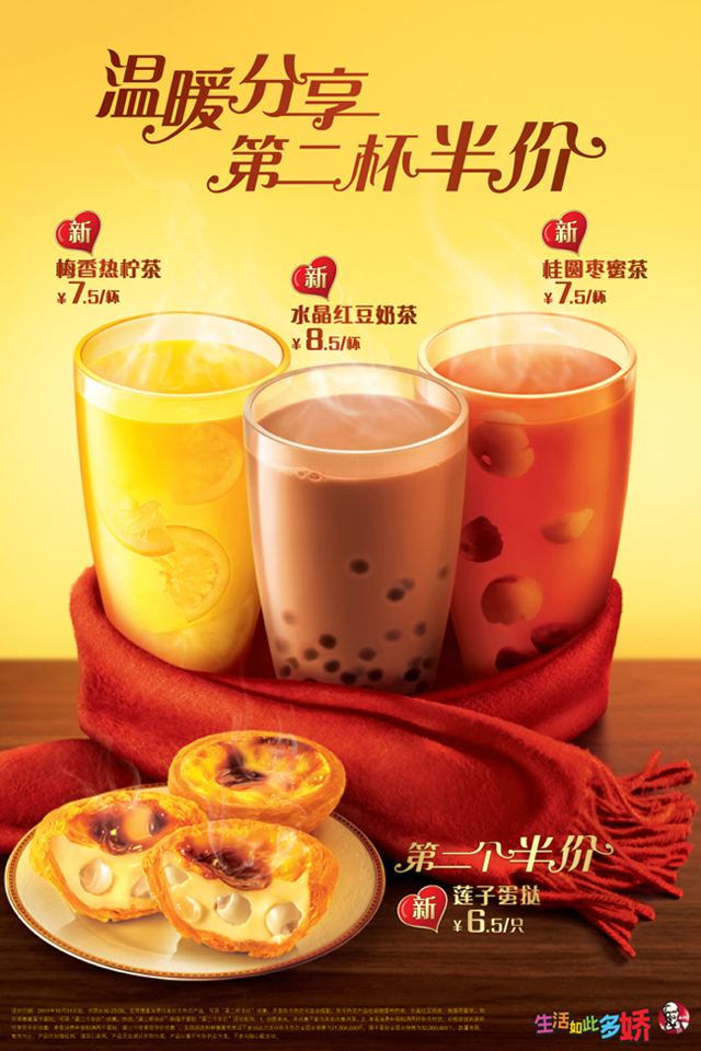 活动介绍: 肯德基秋冬热饮和莲子蛋挞,暖心分享,第二杯半价!