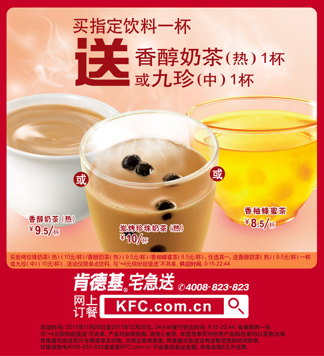 此优惠仅限于肯德基宅急送,欢迎访问肯德基宅急送网上订餐:KFC.com.cn