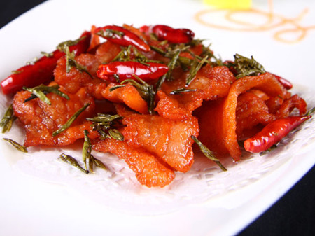 4、锅内留底油,烧至五成热时,下干椒段煸香,再放入五花肉片,加精盐、味精粉炒匀,淋香油,撒葱花,装入竹篱内即可。