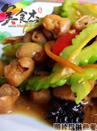1、苦瓜洗净,剖开后去籽,先横切三小段,再直切成条状。 2、大肠先洗净,煮烂再取出,剖开后切条;辣椒切斜片。 3、用2大匙油先炒蒜末,再放入大肠同炒,接着放苦瓜,并加入所有调味料(芡汁除外)。 4、小火烧入味,同时放入辣椒片,烧至汤汁稍收干时,勾芡即可盛出。