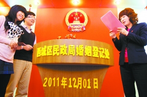 “在今后的生活中,无论遇到什么困难,我们都能以爱和宽容的心善待对方……相亲相爱,永不分离!”昨天是结婚登记颁证仪式正式推行的第一天,在西城区婚登处的颁证厅里,杨鹏和孟颖这对80后小夫妻在庄严的国徽下许下了结婚誓言。