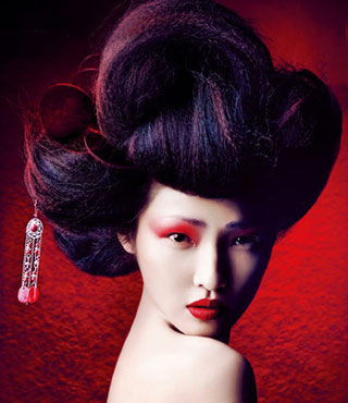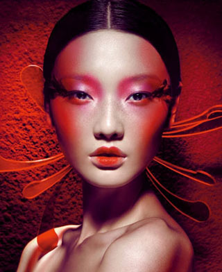 解析:纯粹和造型感是关键。底妆一定要非常均匀,整个妆容只需要强调红色的眼影和唇膏,眼影的涂抹要注意造型感,眼头晕染面积略大,眼尾呈鱼尾状上扬。