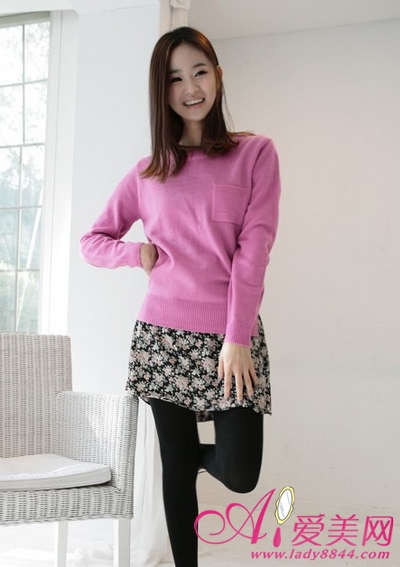 玫红色打底毛衣,搭配碎花短裙,清新活泼,“春”味十足。