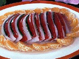 2、油纸抹上芝麻油,平铺汤盘内,将山药片和京糕片颜色相错地摆成几行,码成房脊形,每行中间用青梅依次反方向顺摆成绿瓦状。