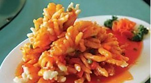 ②将鱼洗净,从口中取出内脏,除去鳃鳞,放入滚水中烫过,抹去浮鳞和水分,剪去脊翅、拨翅。鱼下唇割开,在鱼左面划上斜刀,每隔一刀夹一片火腿,填一层鸡茸。右面划直刀,每刀都填入鸡茸,然后用盐、料酒腌泡。
