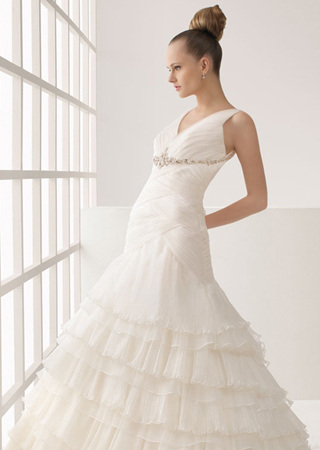 高贵典雅的款式,以简洁、流畅的线条勾勒出新娘优美的曲线;胸部采用鱼骨设计,起到聚拢收紧的效果,塑造出丰满挺拔的感觉;精致的手工刺绣增加隆重华丽之感。
