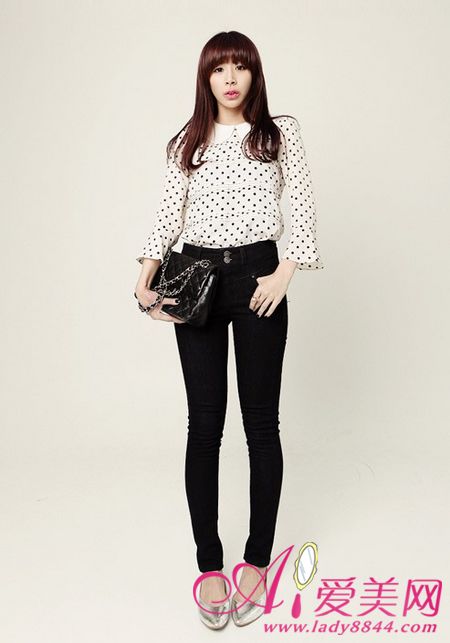 黑色款,中腰铅笔裤,淡淡的水洗黑色,简练自然,前后都有口袋的配置。
