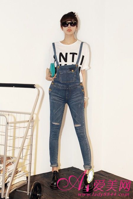 修身的牛仔背带裤,纽扣可以调节被带长度,裤脚比较窄,有点紧身裤版型的牛仔裤,弹力不错,上面可以搭配宽松T恤,或者修身版型T恤,都OK。