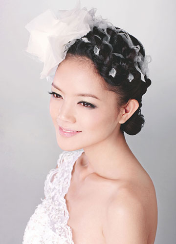将白色的纱带编进发辫中会让发辫更有层次感,再用夸张的发饰加以装饰会让新娘更有春天的浪漫气息,这时发髻要尽量简洁,避免重点过多的杂乱感。