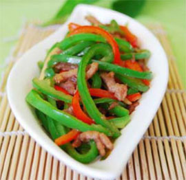 3、加入辣椒和切成丝的茄瓜和木耳,不停地炒,然后加入萝卜丝,加入盐,糖和蚝油调味。炒熟后4、加入麻油生粉芡即可起锅,最后撒入葱花
