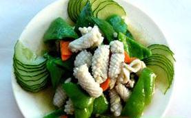 8. 锅留余油,先将蒜米、葱白下锅,泡一下,再入切好的花菇、冬笋、青椒、胡萝卜翻颠几下,依次加入骨汤25毫升、调味品、湿淀粉(勾薄芡)、过油的墨鱼卷,炒几下,即成。