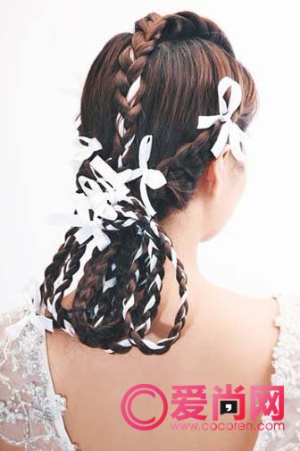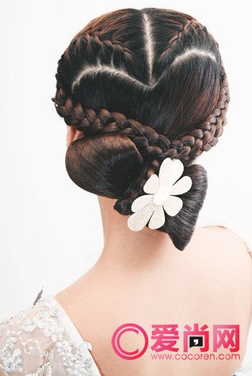 趣味造型辫:造型感很强的辫发是时下大热的元素,用三股辫编织成一个桃心,发尾收成蝴蝶结的形状,有点俏皮的感觉。桃心搭配蝴蝶结,马上让你变身甜蜜公主。婚礼上尝试这种辫发,别具另一番风情。
