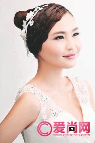 优雅发髻辫:结合了丸子头和蜈蚣辫两种打造手法。用精致的蜈蚣辫缠绕在丸子头顶端,打破传统高发髻的沉闷,最后利用精致的水晶发花点缀在耳际上方,亮点十足。
