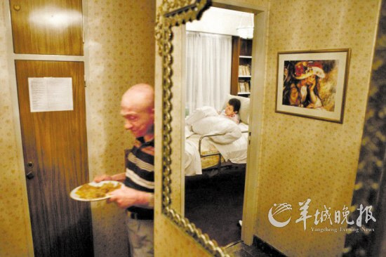 马科斯为妻子端来晚餐。在妻子患病后,由于妻子进食困难,马科斯不得不将食物加工成泥状,方便妻子进食。