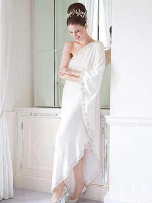 没有华丽的配饰,没有繁复的褶皱,只有一块最简单不过的锦缎,除了修边的设计,几乎找不到一处是经过加工的,如此简单却精致的婚纱,是不是很让你震撼呢,犹如女神般的气场让你是不是也很想试一下呢!