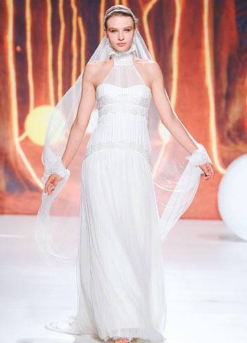 立领裸肩飘逸纱质婚纱,搭配从盘发处延伸的长款头纱,神秘而具有异域风情。轻系手腕处的设计是点睛之笔。