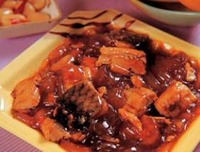 原料:活鲤鱼肉200克、干粉皮、青柿椒段、红辣椒段。调料:甜面酱、酱油、料酒、葱丝、精盐、熟猪油、糖色。