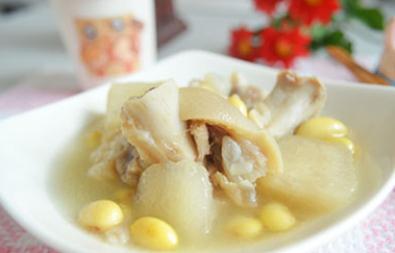 4:汤就煲烧好了,喝之前根据个人口味加盐调味。常喝梨汤对女人是有好处的,梨子自古就有“百果之宗”的美誉,用雪梨来做汤,更可以祛咳润肺,清心美肤。喝这道雪梨黄豆猪手汤,对于光滑皮肤、缓解声沙口干会有明显的效果。