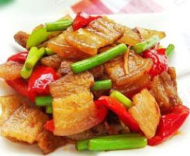 3、烧热2汤匙油,倒入五花肉片不断翻炒,煸至五花肉出油,且呈金黄色,盛起待用。