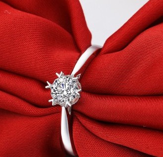 此款钻戒采用经典的六爪镶嵌法。六角的保护使钻石损耗降低。雪花六爪爪镶显钻的款式从多个角度映射出钻石的火彩。