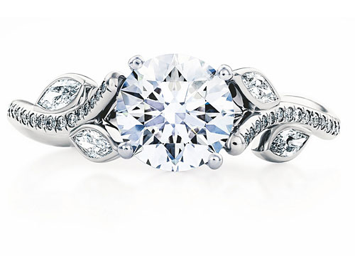 好似闪闪发光的玫瑰花径,上面镶嵌着完整切割的圆形明亮形车工钻石,周围陪衬着橄榄形美钻和优雅的密镶花径。宛如是女子从花丛中采的心爱花束,爱不释手。