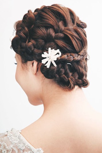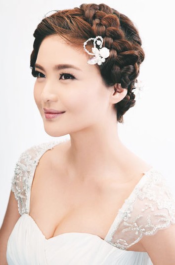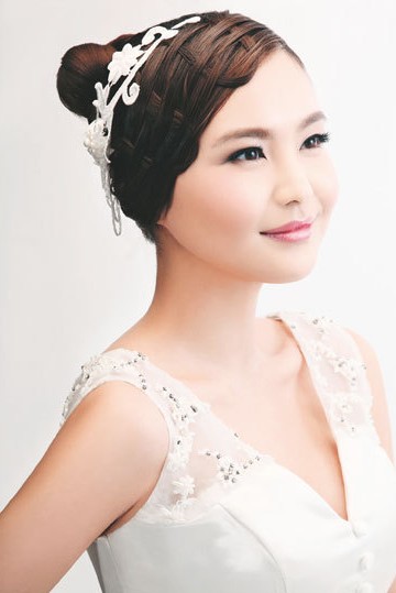 优雅发髻辫:结合了丸子头和蜈蚣辫两种打造手法。用精致的蜈蚣辫缠绕在丸子头顶端,打破传统高发髻的沉闷,最后利用精致的水晶发花点缀在耳际上方,亮点十足。