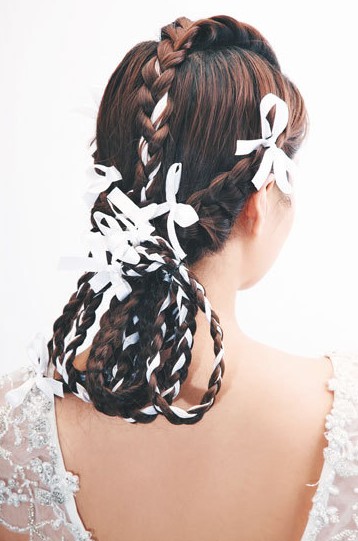 趣味造型辫:造型感很强的辫发是时下大热的元素,用三股辫编织成一个桃心,发尾收成蝴蝶结的形状,有点俏皮的感觉。桃心搭配蝴蝶结,马上让你变身甜蜜公主。婚礼上尝试这种辫发,别具另一番风情。