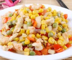 食材:粟米粒一罐 大虾8只 鸡胸肉3两 青豆1两 红椒1枚 鸡蛋