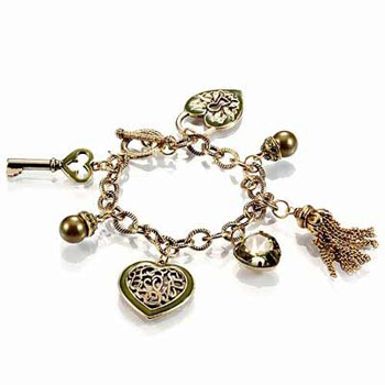 金色手链上坠满了圆币,金色与绿色圆币大小交替排列,圆币上的花纹精美且富于变化,在大气中流露出精致。爱心形的图案与圆币图案相搭配让新娘的腕间绽放奢华的复古风采,显的新娘的腕间更加的修长。