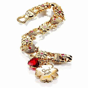 镶嵌着红色宝石的宽大手镯光泽温润,镶满宝石的心星吊坠为整个手镯增添了浪漫爱意。这款非常适合正沉浸在热恋中的女孩,可以将你与爱人的爱情密码刻在宽大的手镯表面,让你们的爱情永不磨灭。