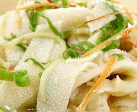 6.将姜丝、葱丝分放在牛百叶表面,加入调味料和熟油,便可食用。
