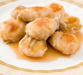 3.烧镬下油搪镬,将有虾胶的那面在底,排放在镬里,用慢火煎至浅金黄色,边煎边下油浸过面,至虾胶熟即取出,排入在碟里,烧镬落油搪镬,溅绍酒,落上汤、老抽、白糖、味精、麻油、胡椒粉,用湿粉勾芡落包尾油推匀,淋在鸭掌上便成。