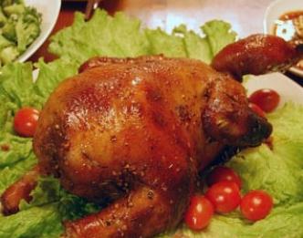 3)鸡装入烤盘后进烤箱烘烤, 胸向上;
