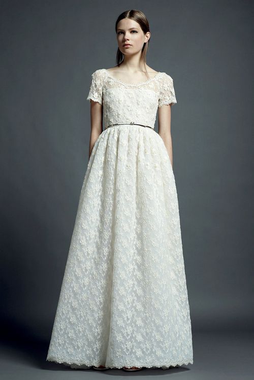 公主蕾丝长裙,淡雅的乳白色蕾丝精致新娘礼服。
