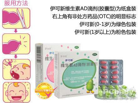 伊可新维生素AD滴剂(胶囊型)为纸盒装,右上角有非处方药品(OTC)的明显标志,伊可新(0-1岁)为绿色包装,伊可新(1岁以上)为粉色包装。颜色鲜艳,小葫芦形象可爱,能够在视觉上吸引宝宝注意力,让宝宝更容易接受。