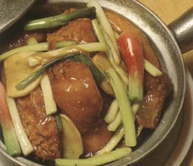 4)放入酒加调味慢火焖至入味勾芡,放入葱、香菜原煲上台即可。