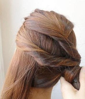 步骤四:把上面那部分头发随意的扭转,注意不要太紧哦!方向向着右边的马尾绕起来,分界线要记得盖住哦!