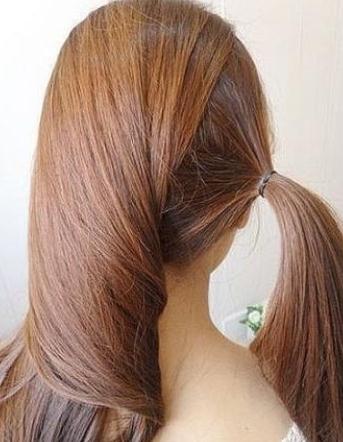 步骤二:把右边在耳朵旁边扎一个马尾,左边梳开,盖住分界线。
