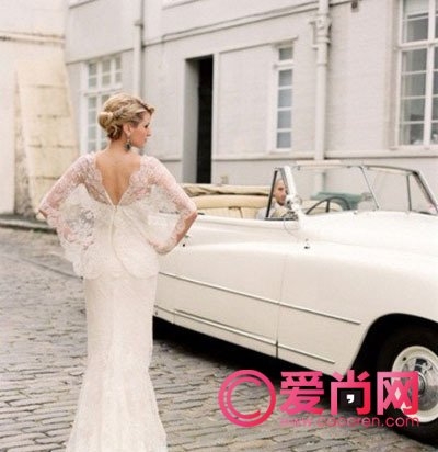 精致的蕾丝薄纱袖子设计是这款婚纱的亮点,新娘高盘的发髻,深V的露背,简洁的耳饰,妆点出无以伦比的奢华效果,浪漫的一袭大裙摆,无限的妩媚风情洋溢满身。