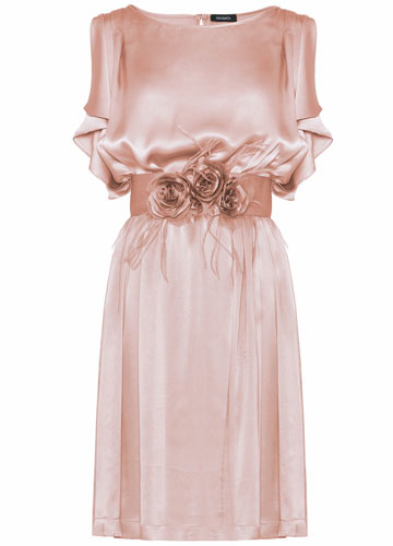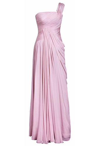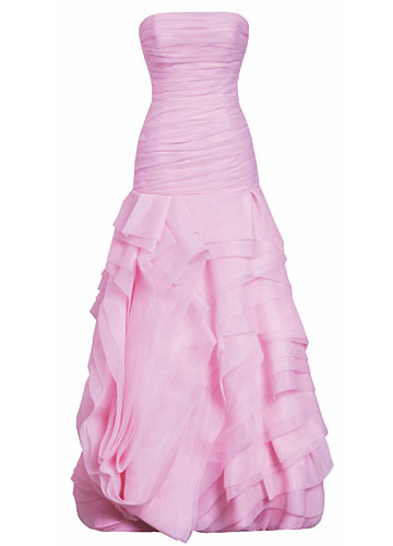 2. 淡粉色系礼服裙也分冷暖色调,肤色偏黄的伴娘,最好选用偏白的冷调粉红色,并用闪亮水晶元素来映衬自己的肤色。