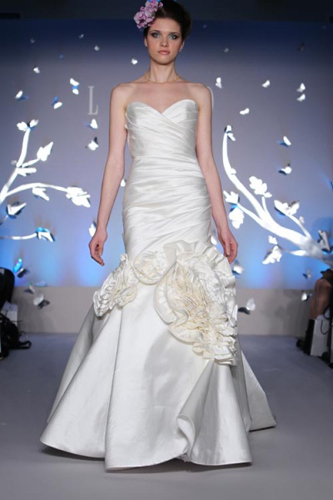 此款无带婚礼服上,羽毛装饰的胸衣成为特色